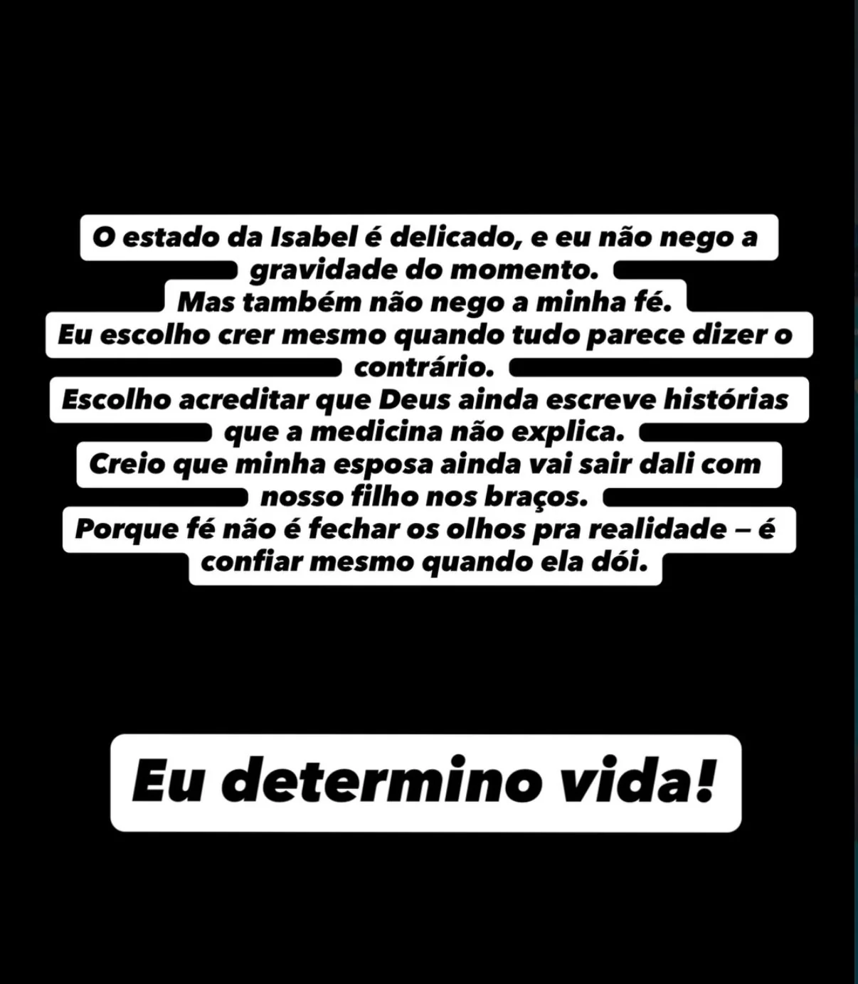 Lucas ressaltou que, embora reconheça a gravidade do estado de saúde de Isabel, mantém a fé no processo de recuperação. “O estado da Isabel é delicado, e eu não nego a gravidade do momento. Mas também não nego a minha fé. Escolho acreditar que Deus ainda escreve histórias que a medicina não explica. Creio que minha esposa vai sair dali com nosso filho nos braços”, afirmou.