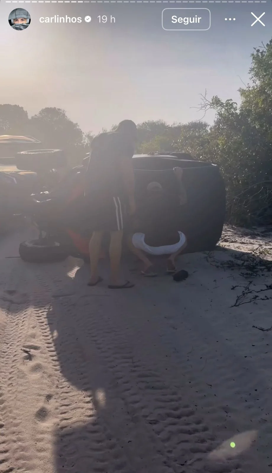 Nos stories do Instagram, Carlinhos, famoso por mostrar sua rotina como um reality, registrou a turma acelerando o buggy elétrico pela areia. Entre risadas, vento no rosto e velocidade, a diversão saiu do controle quando Lucas perdeu a estabilidade e capotou.