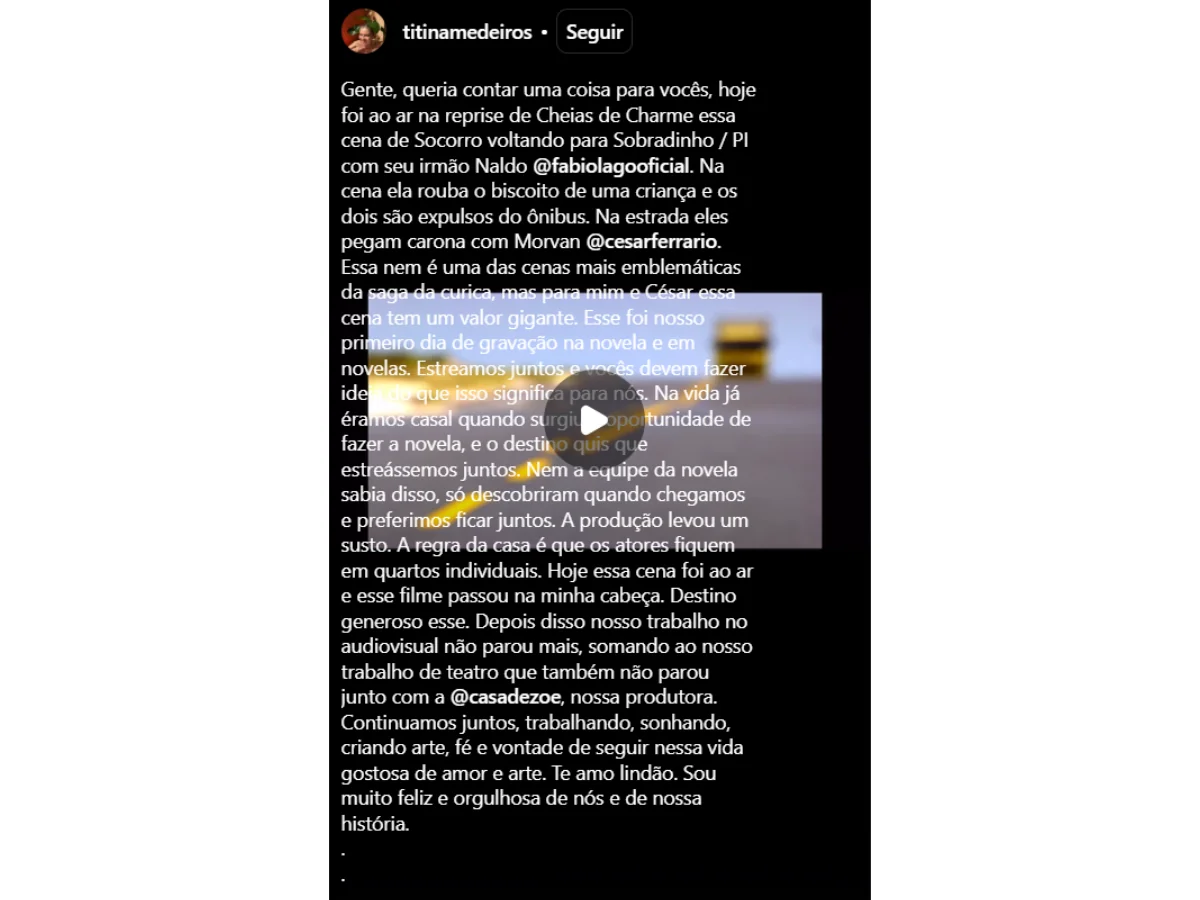 “Essa nem é uma das cenas mais emblemáticas da saga da curica, mas para mim e César, essa cena tem um valor gigante”, escreveu a artista, lembrando que foi a primeira gravação dos dois em uma novela e que já eram casal quando surgiu a oportunidade.