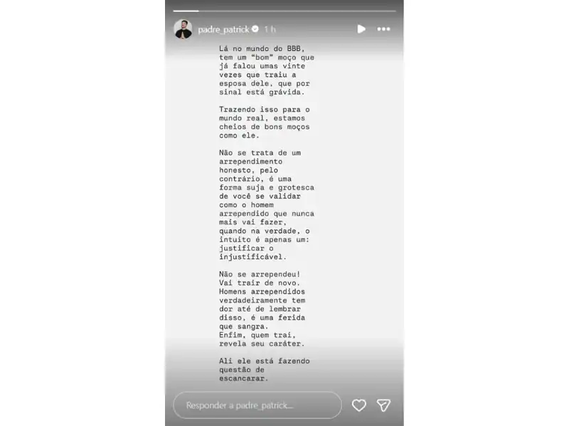 Ao iniciar sua mensagem no Instagram, o sacerdote observou: “Lá no mundo do ‘BBB’, tem um ‘bom moço’ que já falou umas vinte vezes que traiu a esposa dele, que, por sinal, está grávida. Trazendo isso para o mundo real, estamos cheios de bons moços como ele. Não se trata de um arrependimento honesto; pelo contrário, é uma forma suja e grotesca de você se validar como homem arrependido que nunca mais vai fazer, quando, na verdade, o intuito é apenas um: justificar o injustificável”.