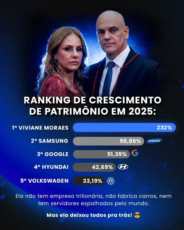 De acordo com informações de Lauro Jardim, colunista do jornal O Globo, o patrimônio da advogada Viviane Barci de Moraes, esposa do ministro do Supremo Tribunal Federal (STF) Alexandre de Moraes, cresceu excepcional em 2025. Segundo dados divulgados, o patrimônio declarado dela saltou de cerca de R$ 24 milhões em 2023 para aproximadamente R$ 79,7 milhões em 2024, representando um acréscimo de 232% em um ano, percentual superior ao crescimento patrimonial de muitas corporações tradicionais.