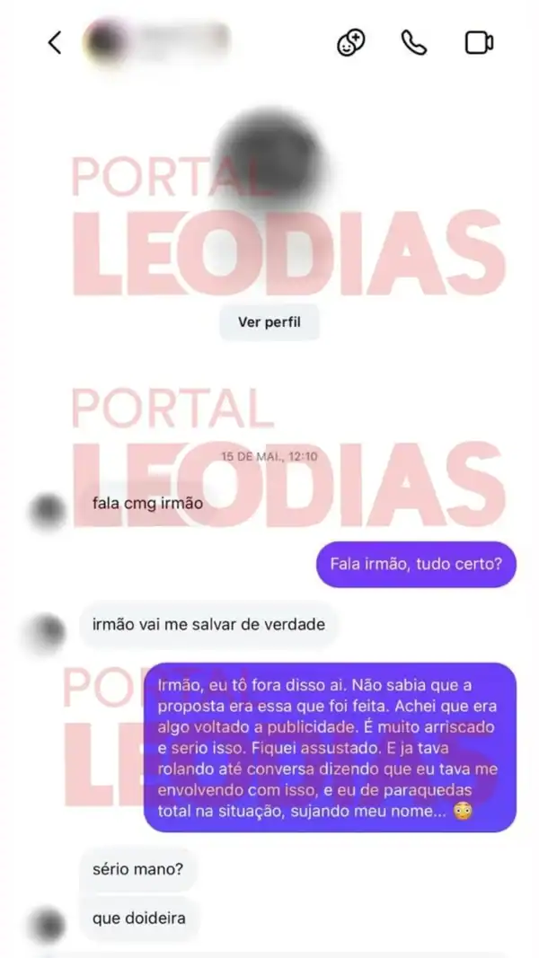 A reportagem teve acesso a prints de uma conversa de 15 de maio de 2025, em que um atleta do ABC Futebol Clube procura Igor Freitas pedindo ajuda: “Fala comigo, irmão. Irmão, vai me salvar de verdade”. O empresário responde que não sabia que a proposta envolvia manipulação de resultados: “Achei que era algo voltado à publicidade. É muito arriscado e sério. Eu caí de paraquedas nessa situação e meu nome acabou sujo por algo que não fiz.”