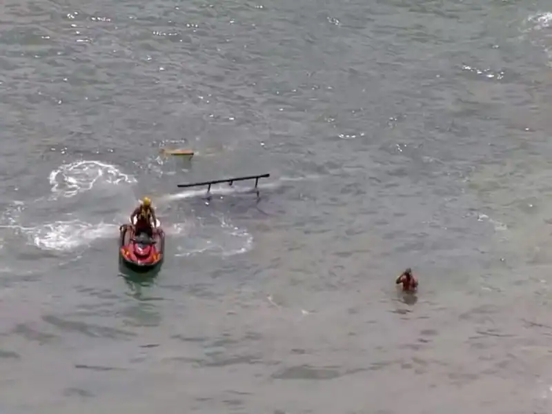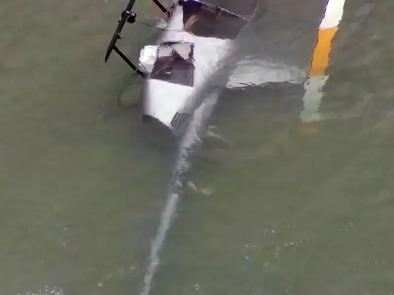 O helicóptero chegou a afundar cerca de dois metros até encostar no fundo arenoso, tombando em seguida e ficando com os esquis para fora da água.
