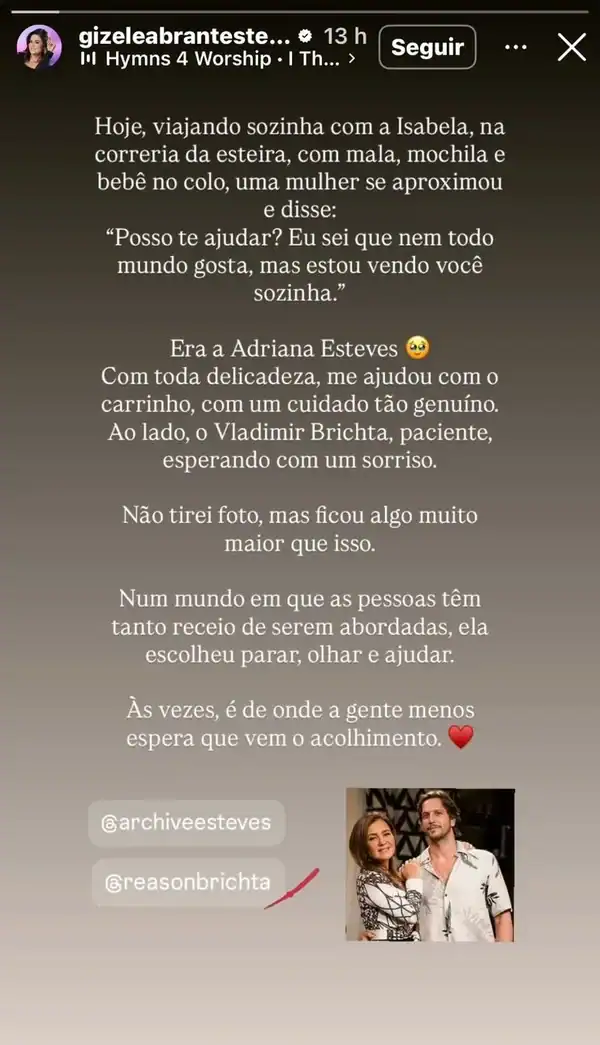 “Hoje, viajando sozinha com a Isabela, na correria da esteira, com mala, mochila e bebê no colo, uma mulher se aproximou e falou: ‘Posso te ajudar? Sei que nem todo mundo gosta, mas estou vendo você sozinha.’ Era a Adriana Esteves. Com muita delicadeza, ela me ajudou com o carrinho, com um cuidado realmente genuíno”, contou Gizele.