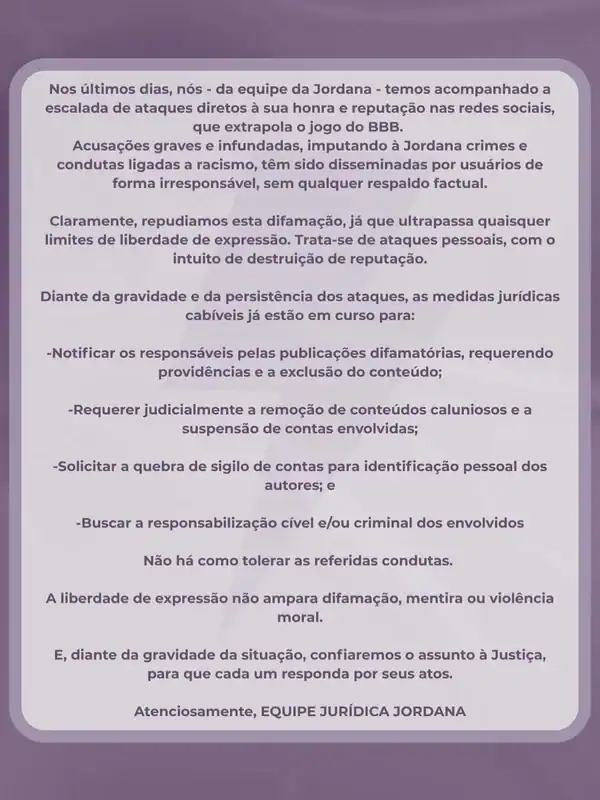Em nota publicada no perfil oficial de Jordana no Instagram, a equipe denunciou os ataques e afirmou que as acusações afetam diretamente a imagem dela fora do reality. “Nos últimos dias, nós – da equipe da Jordana – temos acompanhado a escalada de ataques diretos à sua honra e reputação nas redes sociais, que extrapola o jogo do ‘BBB’”, diz o comunicado.