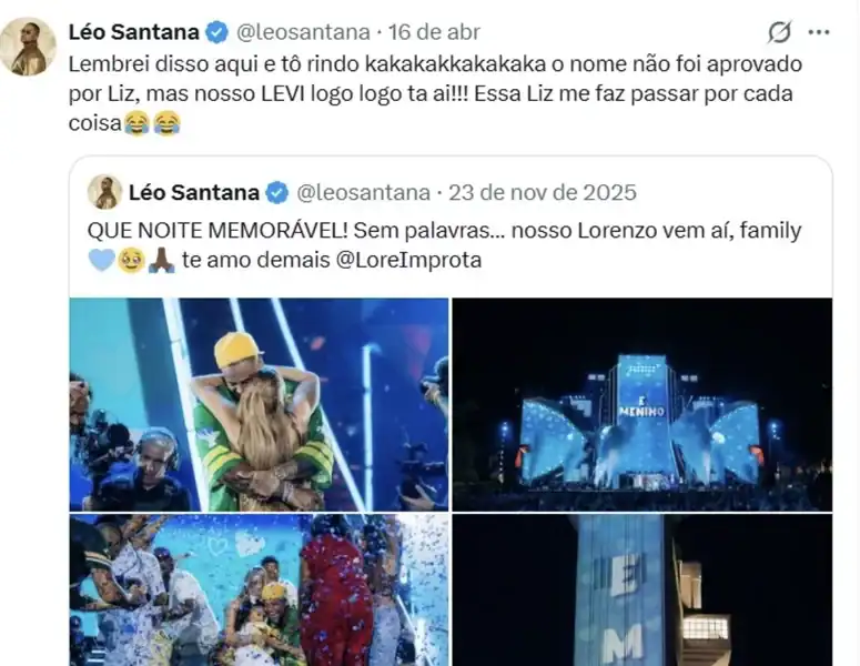 “Lembrei disso aqui e estou rindo. O nome não foi aprovado por Liz. Mas nosso Levi logo, logo chega! Essa Liz me faz passar por cada situação”, escreveu o artista no X, antigo Twitter, ao compartilhar uma publicação antiga de novembro de 2025, quando ele e Lore descobriram que teriam um menino.