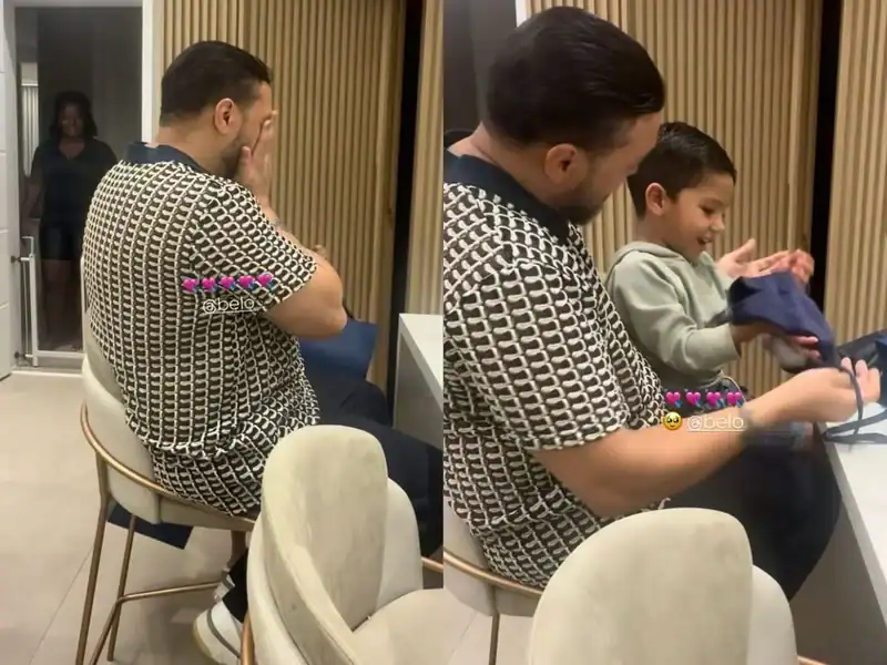 Durante a surpresa, o cantor divertiu a todos com sua ansiedade e com a fofura de Zion ao participar da brincadeira. Ao abrir os pacotes, o momento em família ficou ainda mais marcante: a primeira sacola trazia uma sunga azul para Zion, enquanto a segunda continha uma peça igual para Belo.