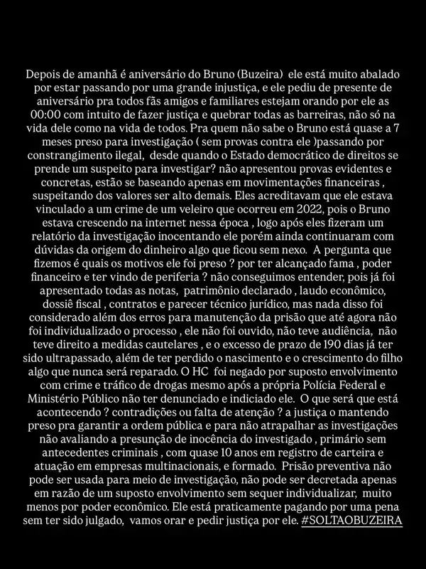 No texto divulgado em seu perfil oficial, a equipe relata que Buzeira está emocionalmente abalado às vésperas de seu aniversário e pediu que seguidores, amigos e familiares façam orações por ele. “Pra quem não sabe o Bruno está quase a 7 meses preso para investigação passando por constrangimento ilegal, desde quando o Estado democrático de direito se prende a um suspeito para investigar? Não apresentou provas evidentes e concretas, estão se baseando apenas em movimentações financeiras”, diz parte da publicação, que também questiona a falta de audiência e de alternativas à prisão.